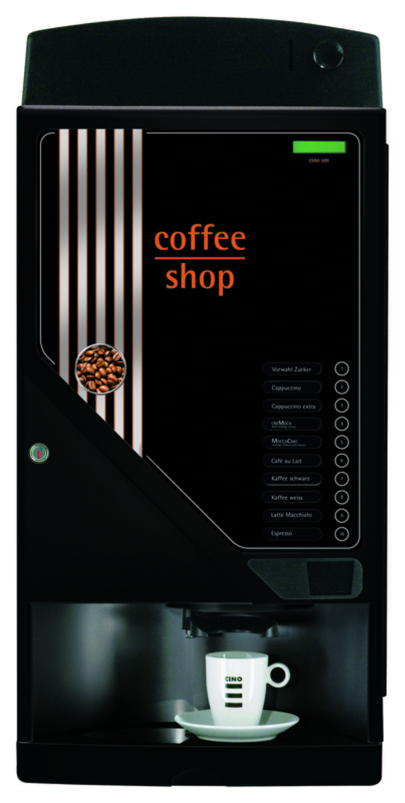 دستگاه وندینگ قهوه مدل cino xm instant مربوط به شرکت سازنده ی  ایتالیایی rhea vendors در طبقه بندی دستگاه های فروش خودکار قهوه فوری قرار میگیرد. وازه ی instant  در انتهای نام این مدل حاکی از استفاده ی دستگاه از پودر های فوری قهوه و شکلات و شیر دارد که در کشور ایران بسیار متداول می باشد و بسیاری از کاربران از این نوع دستگاه ها به عنوان نسکافه ساز یاد می کنند. دستگاه فروش اتوماتیک مدل سینو (cino xm) دارای 6 مخزن پودر بوده و 10 تنوع به مشتری یا کاربر ارائه می دهد.این دستگاه وندینگ دارای کابینت مخصوص هم می باشد که در صورت استفاده در مکان هایی با فضای بیشتر ، دستگاه را به صورت یک تکه و با ارتفاع بالاتر نشان می دهد. تمامی قطعات این مدل دستگاه و مدل های هم خانواده ی این نوع دستگاه وندینگ قهوه توسط شرکت تیام وندینگ به مشتریان عرضه می شود.